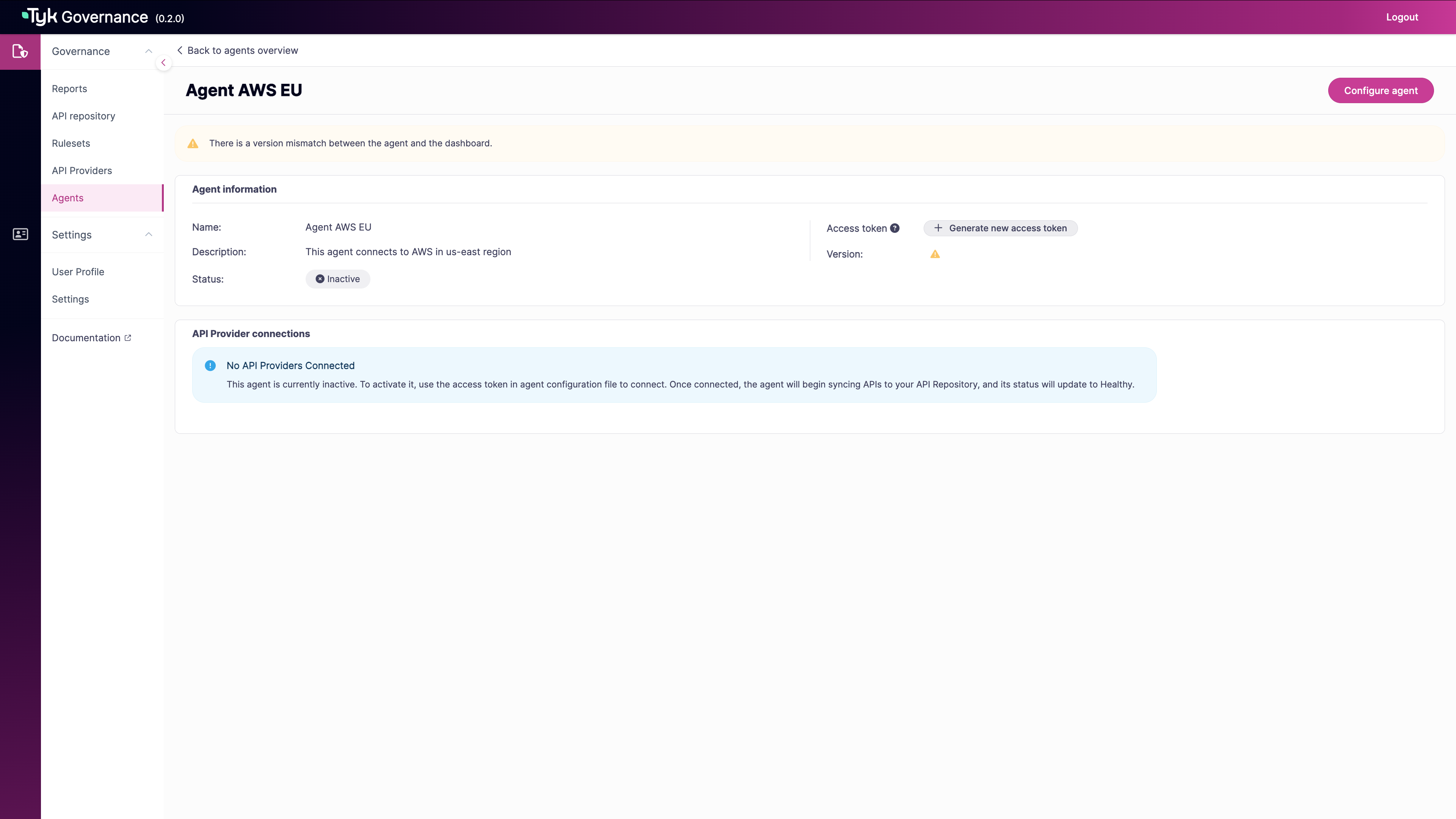 - Network connectivity between the agent and both the Governance Hub and your API provider